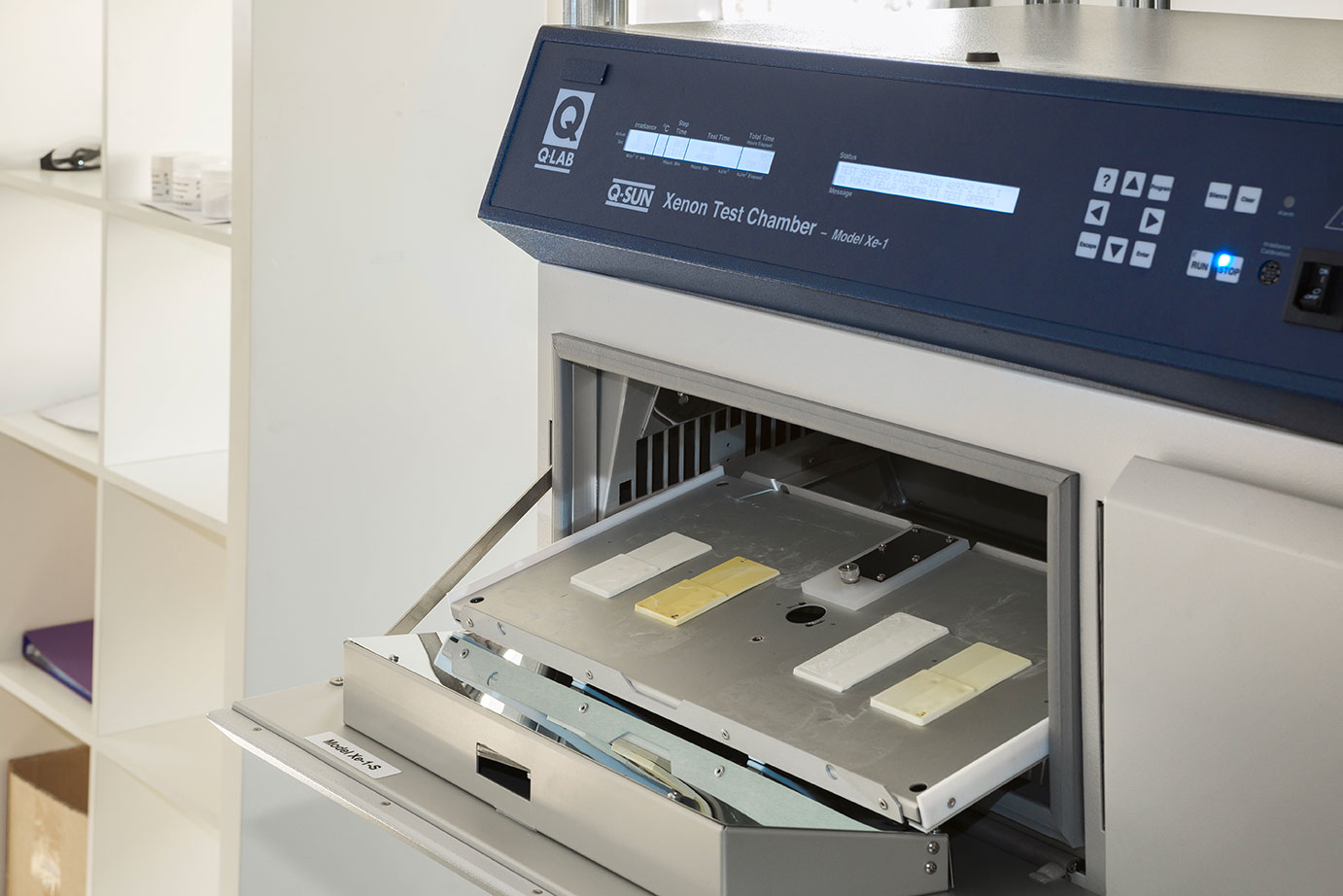 Il laboratorio Imaco è attrezzato con colorimetri e lampade con cui vengono effettuate prove di invecchiamento, di solidità alla luce, di imitazione colore, in trasparenza o in coprenza assoluta. Il laboratorio è stato concepito per produrre campionature veloci garantendo qualità, affidabilità e ripetibilità. Gli strumenti di controllo sono estremamente efficaci permettendo all'azienda di aspirare alla perfezione.